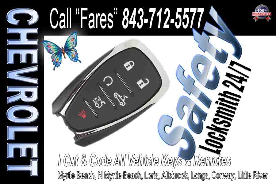 Chevrolet Remotes – My van is fitted and stocked with a fully mobile Locksmith Myrtle Beach service system, I can come to you anytime of the day! Since we’re open 24 hours a day, 7 days a week, there’s no need to panic when you’re in a bind. We never charge extra for nights, weekends or holidays, because we know stressful situations never take a break. Some services we offer are car lock out, car lock replacement, car lock repair, ignition replacement, ignition repair, car key extraction, broken lock replacement, broken lock repair, and more! Call and ask for Fares Today (843) 712-5577
